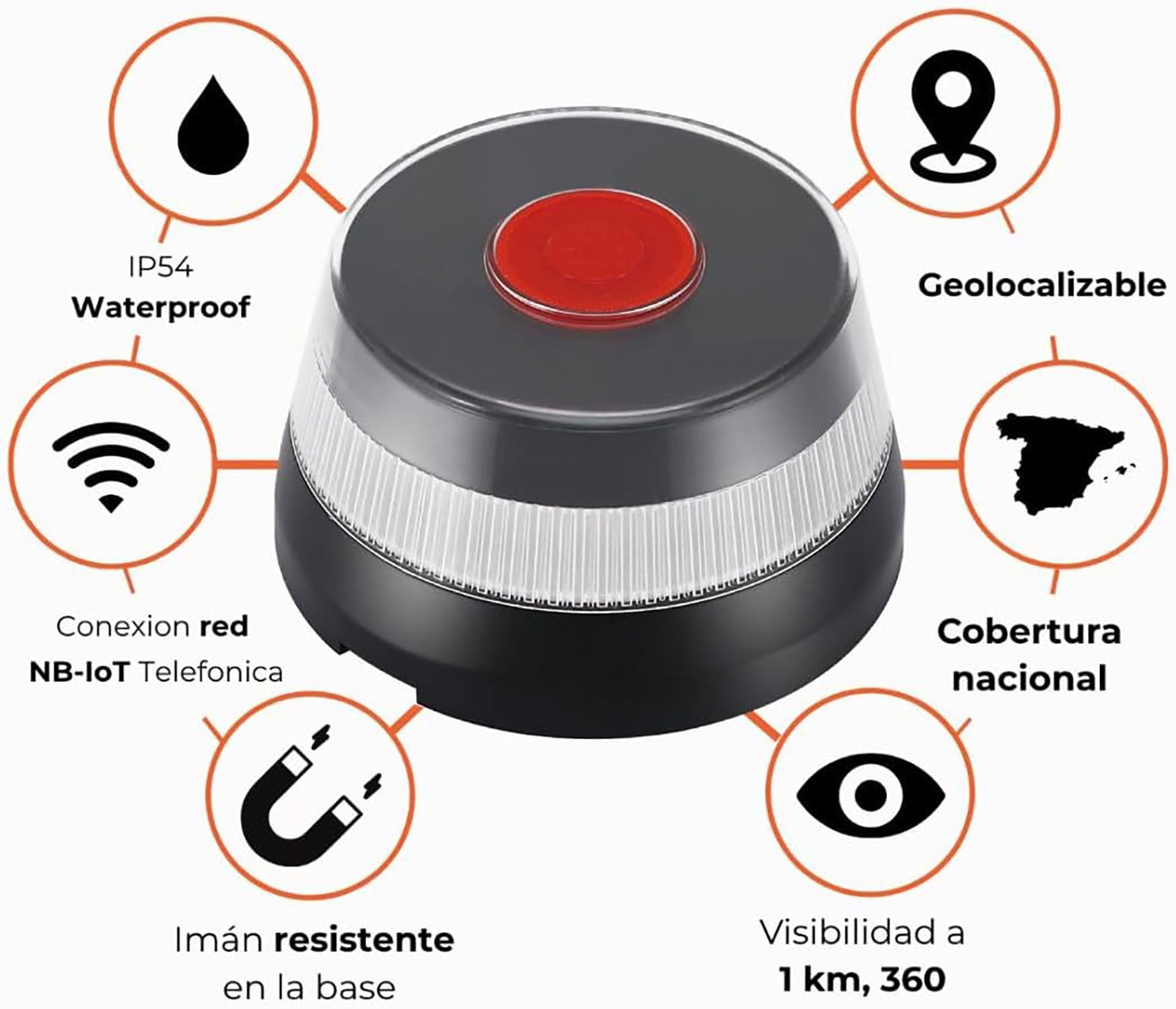 Luz de socorro homologada y geolocalizada V16 - Certificada por la DGT - Base magnética - IP54 a prueba de agua - Pilas alcalinas incluidas 3*LR6 AA - Autonomía máxima de 6 horas - Conexión IoT - Conectividad sin suscripciones ni costos adicionales - Servicio de conectividad garantizado durante 12 años - Hasta 12/2038 de datos incluidos - Geolocalizado. Aumenta tu seguridad y la de otros usuarios de la carretera - Visible a 1 km de distancia y 360° - Ref. V16IoT - Dispositivo recomendado y de sustitución para triángulos de emergencia - Uso obligatorio a partir de 2026 - Tamaño: 94*51mm Símbolo de señalización de emergencia - V16 - con geolocalización y homologación DGT - Batería incluida. El LED 2.W V16 Emergency Beacon con geolocalización 3.0 es el dispositivo de señalización de carretera más avanzado y seguro en el mercado. Homologado por la DGT (Autoridad de Tráfico Española) y compatible con las regulaciones que entrarán en vigor en enero de 2026, este señal de socorro reemplaza los triángulos de emergencia tradicionales, proporcionando mayor seguridad, visibilidad y conectividad en situaciones de alto riesgo en la carretera. Total seguridad sin salir del vehículo Diseñado para ser fácilmente colocado en el techo del vehículo utilizando un potente imán, el señal de socorro V16 se activa sin necesidad de salir del coche, evitando una exposición innecesaria al tráfico. Su potente luz LED amarilla secuencial de 360° garantiza la visibilidad